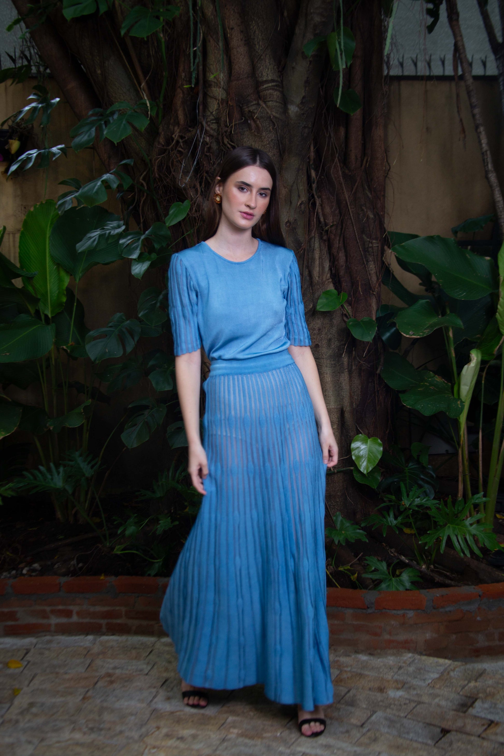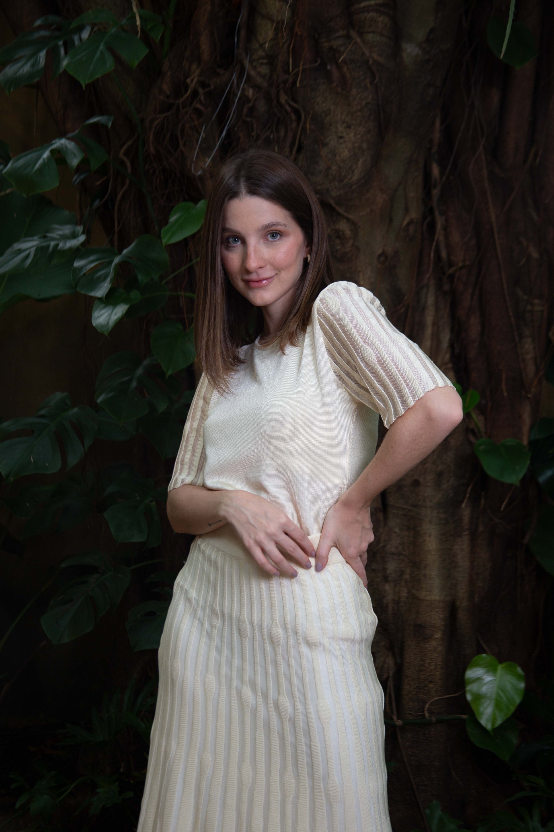 A blusa Amalia é uma peça confeccionada em Tricot, seu corpo tem uma modelagem mais justa ao corpo fazendo com que a peça tenha um caimento perfeito e seja muito confortável. O tecido do corpo é liso e das mangas, tem uma textura de faixas com uma leve transparência. A peça tem manga curta e não muito justa.