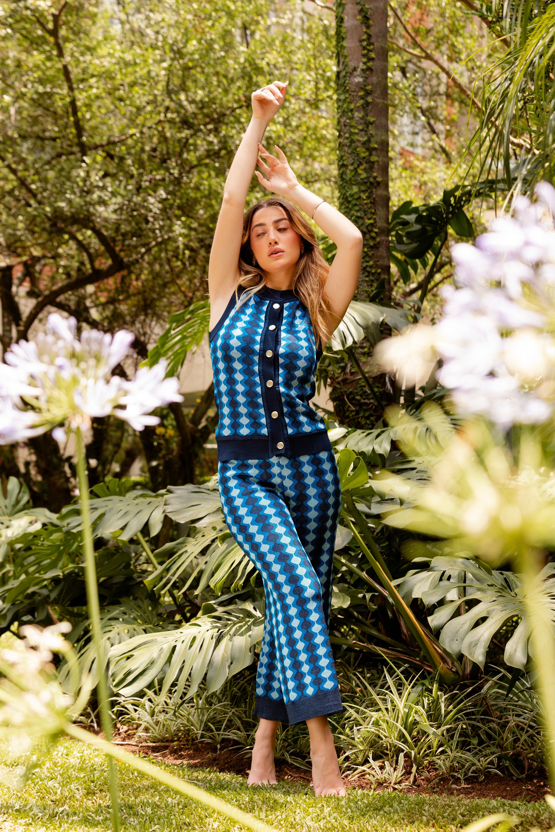 Calça pantacourt em jacquard de tricot. Tecido leve e gelado, Malha tricolor e muito confortável.