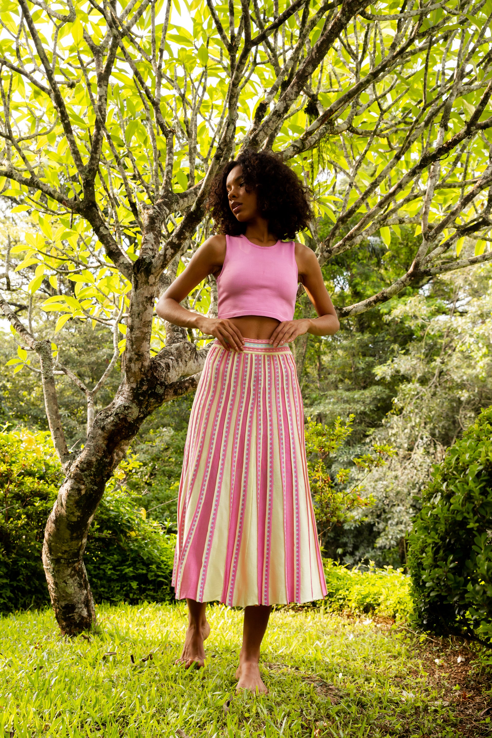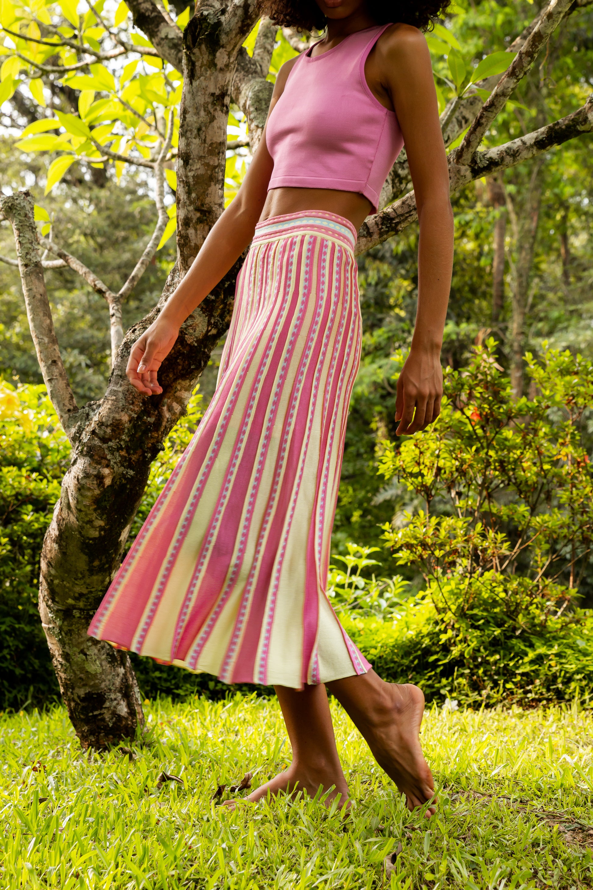 Saia Midi em Tricot bem rodada, com corte mais seco na parte superior. Desenho de faixas com bolas. Malha bem leve. Peça contém forro.