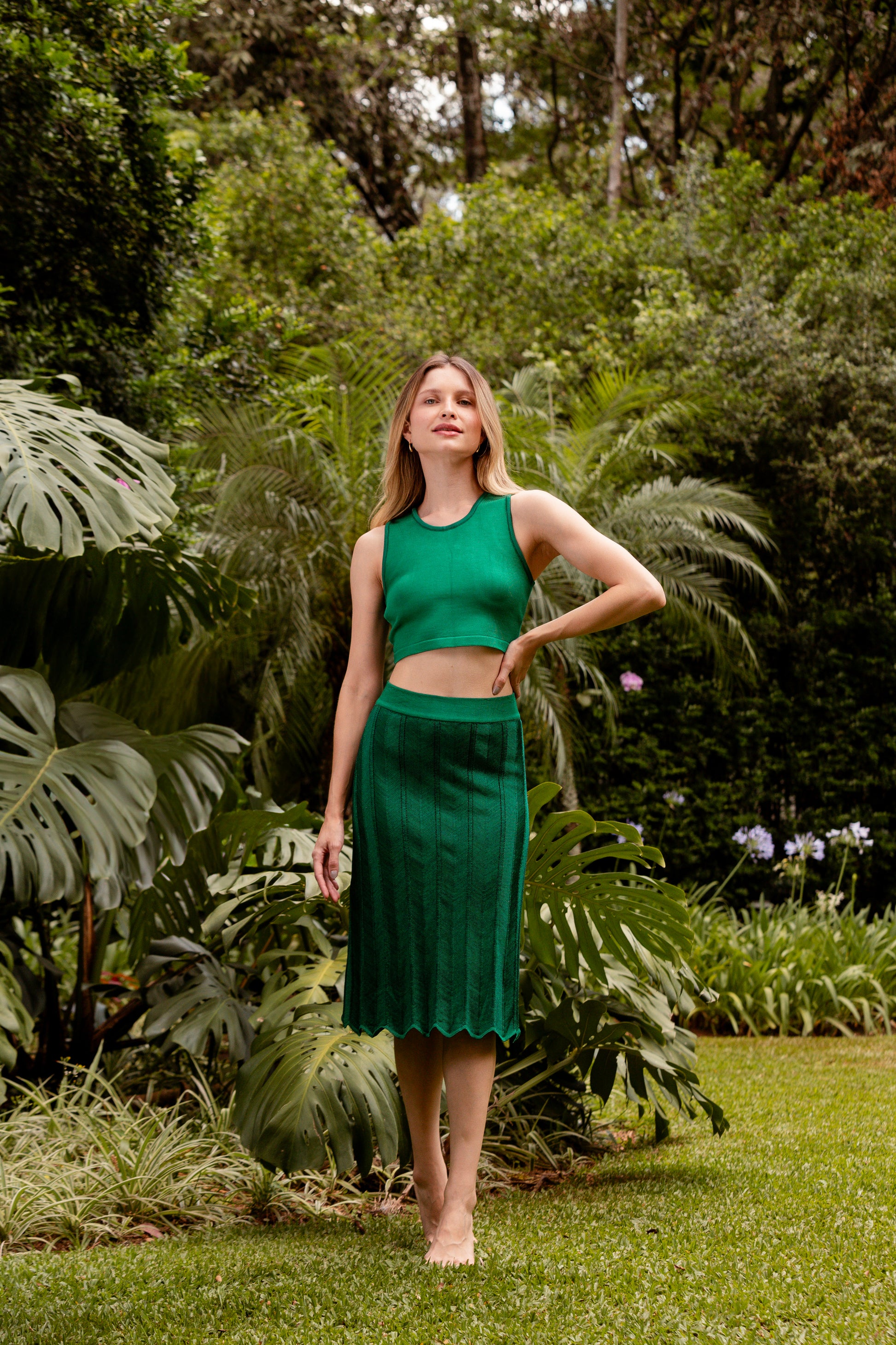 Saia midi com textura em V. Toque leve e gelado. Acabamento em zigzag.