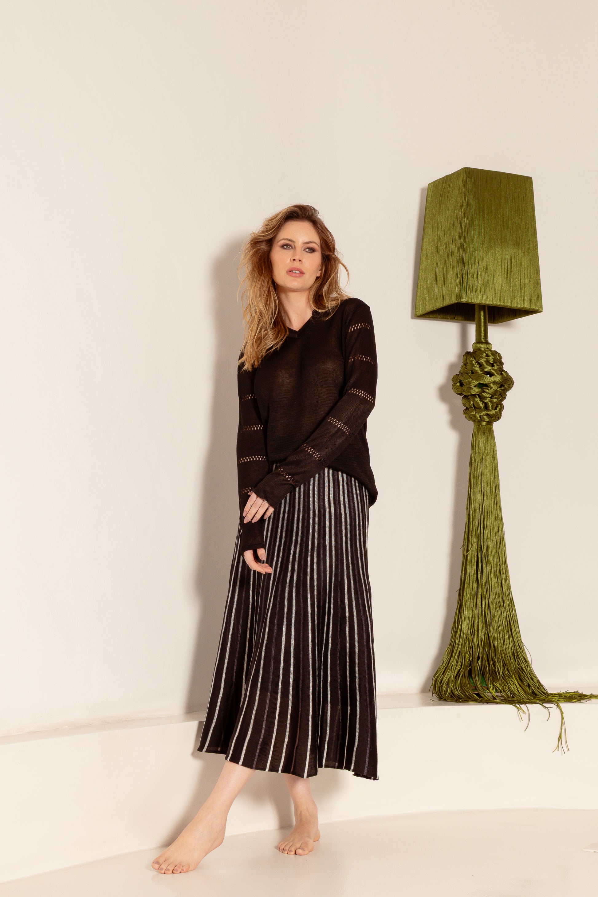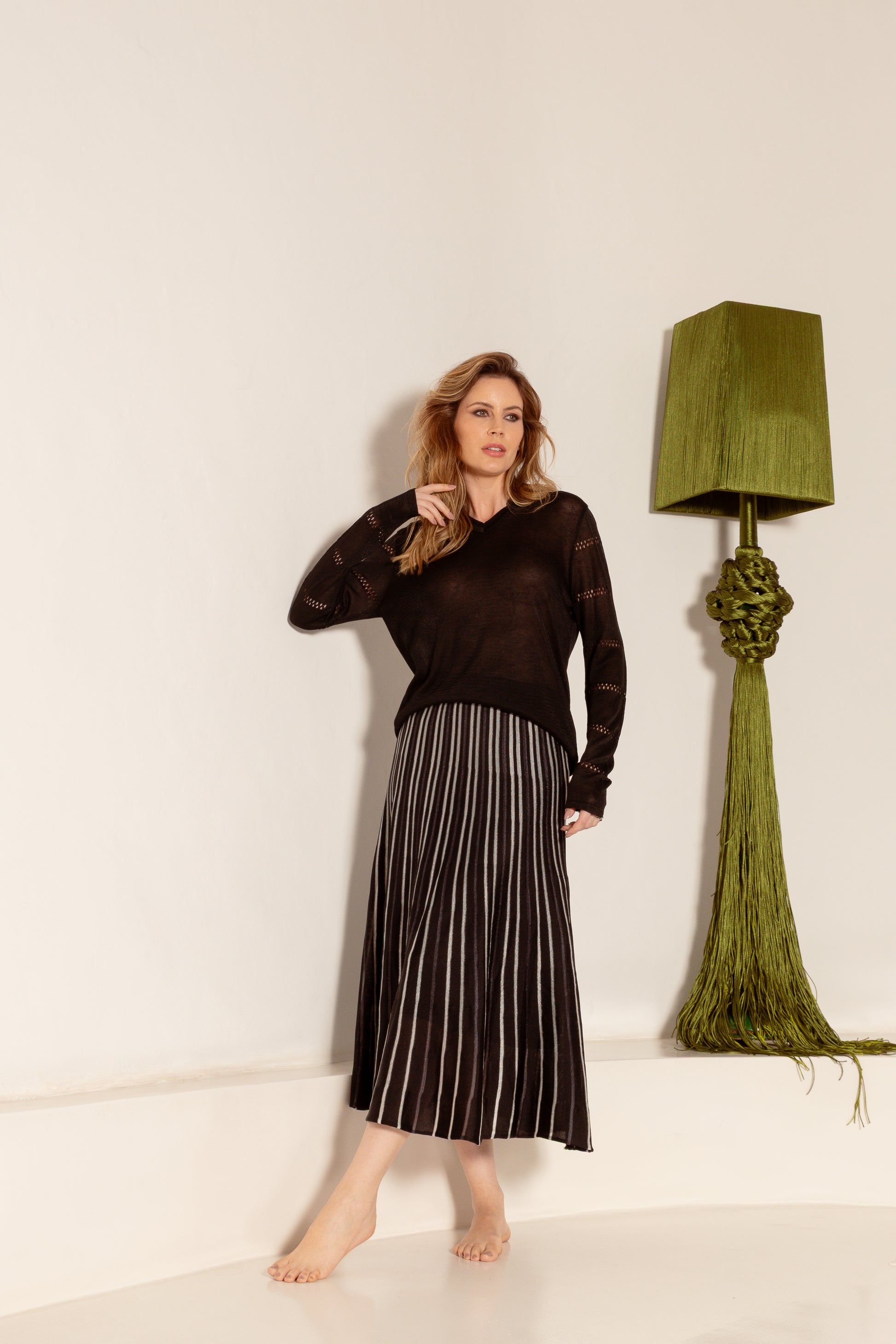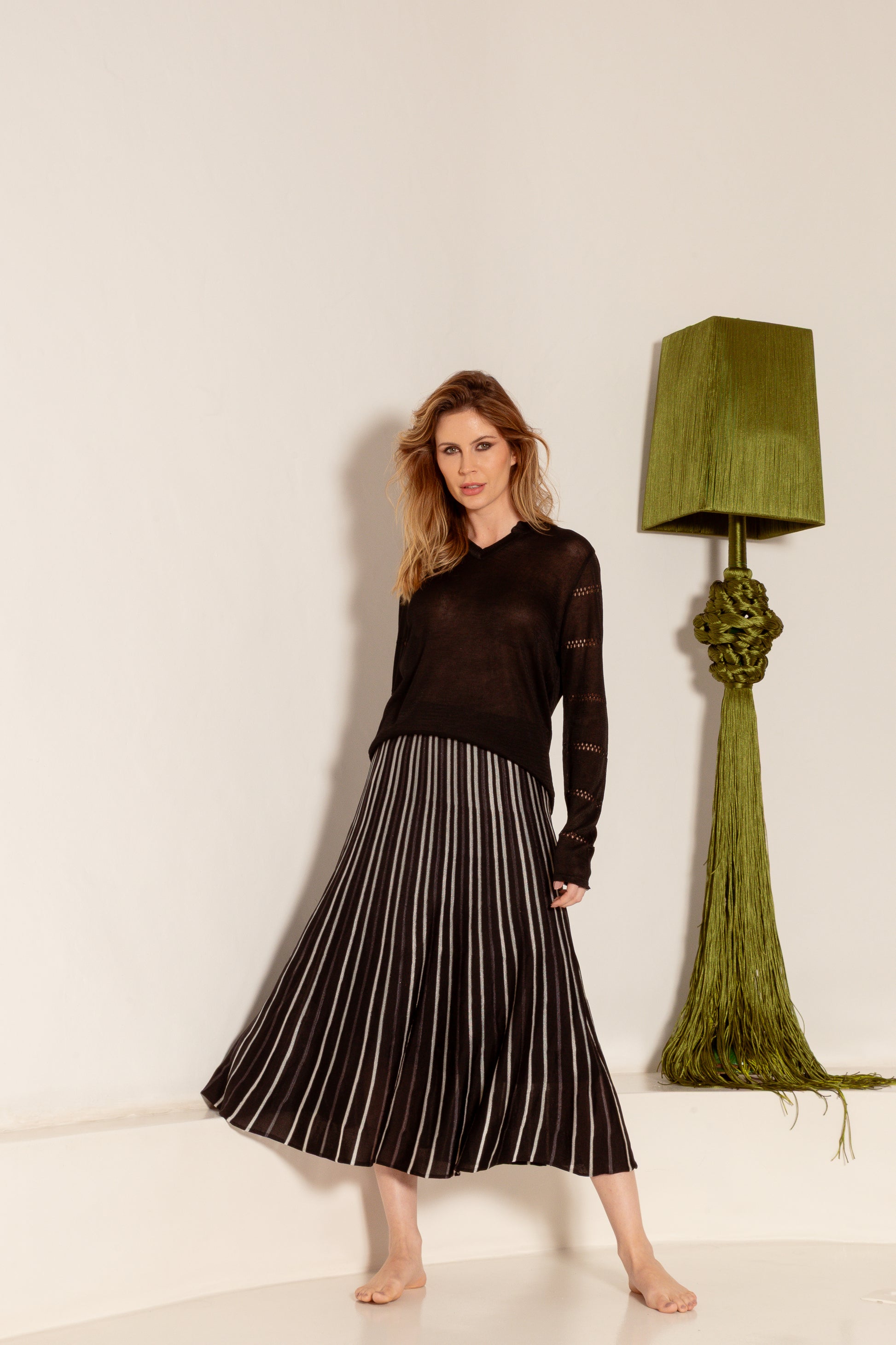 Saia em tricô midi rodada tricolor. Textura e desenho em riscas. Malha leve e mais gelada. Cós com alta elasticidade