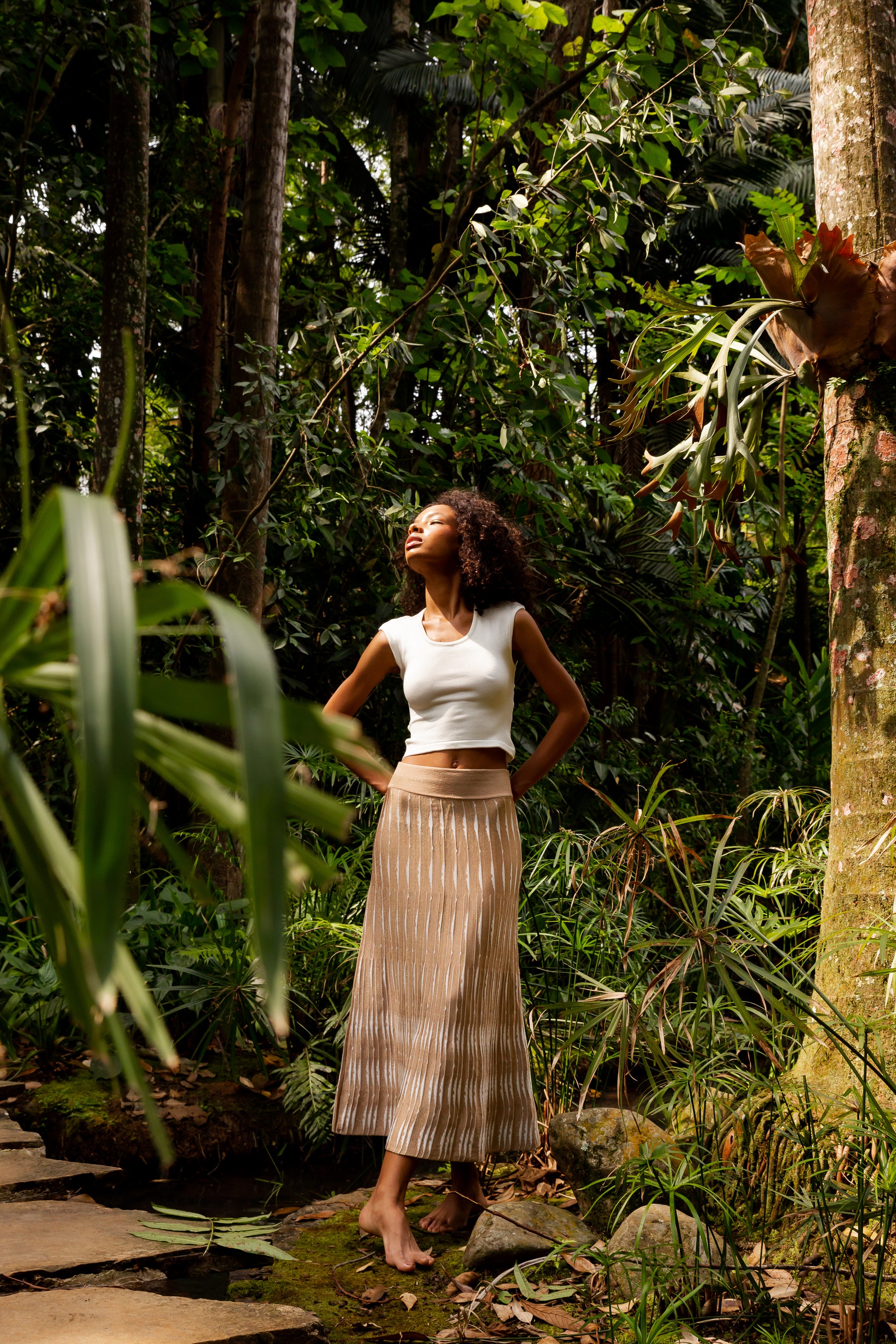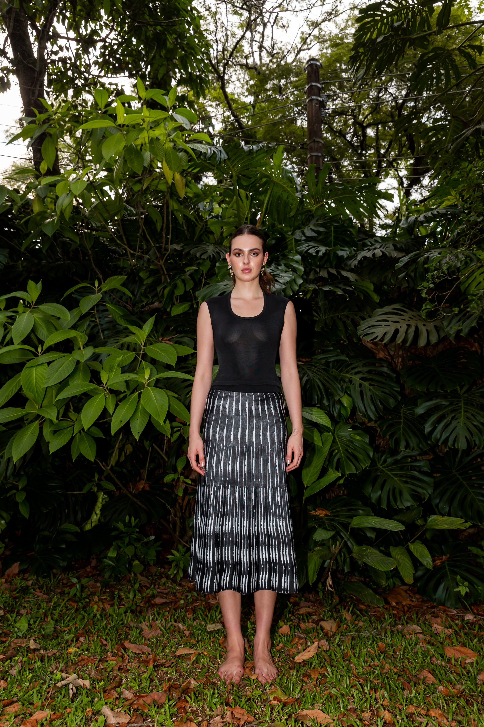 Saia em tricô midi rodada bicolor. Textura e desenho em riscas. Malha leve e mais gelada. Cós com alta elasticidade