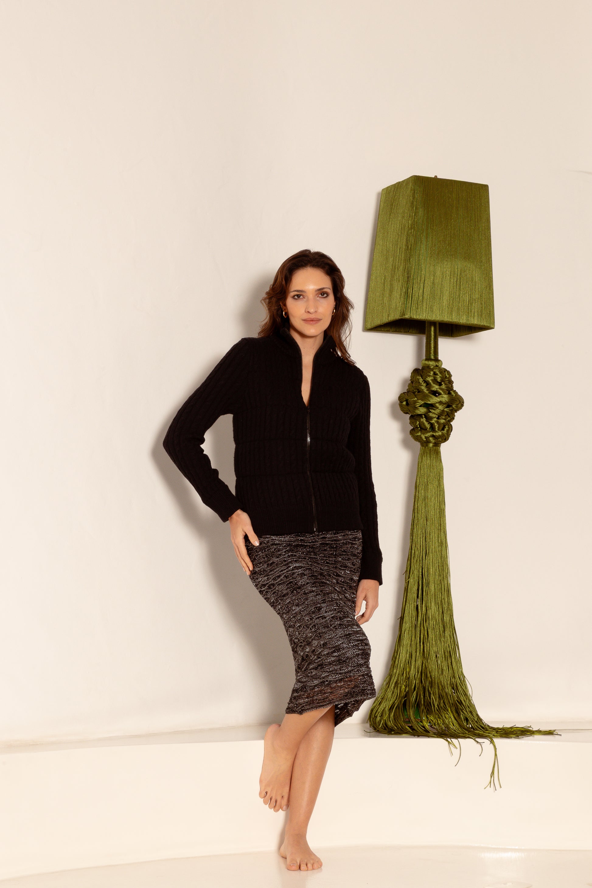 Saia Midi Bicolor em Tricot. Modelagem mais reta. Tricot vazado em formato de ondas.