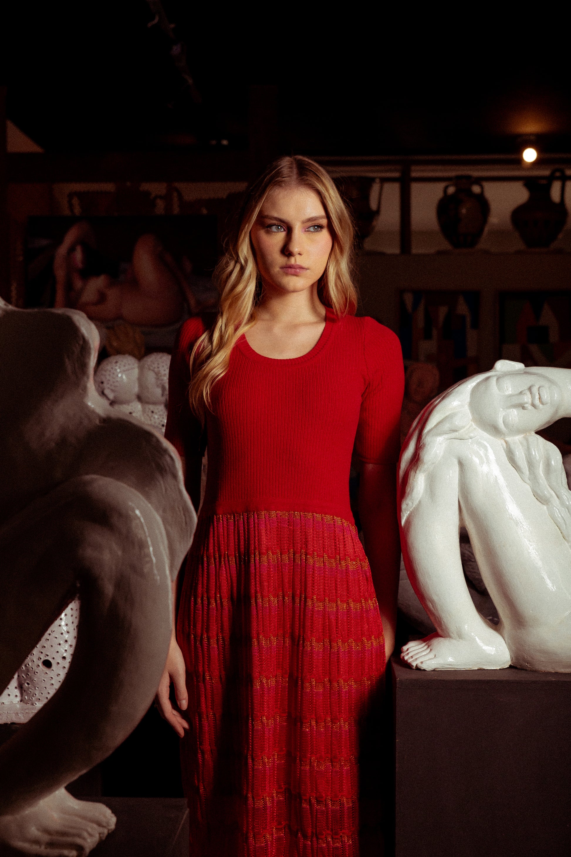 Vestido Midi de manga curta. Parte superior canelada e com bastante elastano. Parte da saia com leve transparência e trabalho em zigzag. Peça acompanha forro.